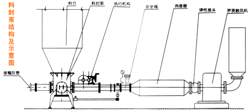 料封泵由擴散室、泵體、活動風管,執行機構等部分組成。低壓空氣經進風管、泵體,進入擴散室。高速氣流通過泵體時把噴嘴周圍物料氣化,出噴嘴進入擴散室的氣流在噴嘴與擴散室形成局部負壓,把氣化物料吸入輸料管,被高速氣流提升到卸料點,其結構示意圖如下: